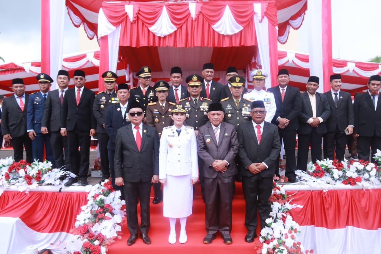 Danrem 152/Baabullah dan Ketua Persit KCK Koorcab Rem 152 PD XV/Pattimura Hadiri Upacara Detik-Detik Proklamasi HUT ke-80 RI di Maluku Utara